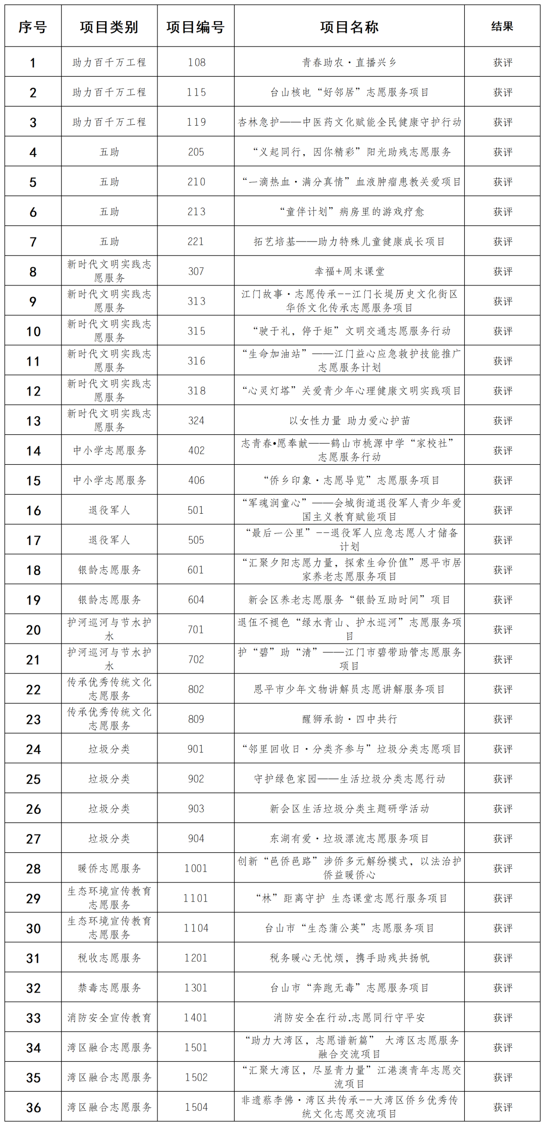 项目大赛自7月份正式启动以来,在各主办单位的广泛宣传发动下,共吸引全市132个公益志愿服务项目申报参评。经过初审、集中培训、复审等环节,最终36个优秀项目脱颖而出获评。主办单位将为每个获评项目提供5000元扶持资金,合计18万元,各主办单位还为36个获评项目代表颁发“江门市重点培育项目”证书,同时通过公益结对、优化提升、评估督导等多元方式,进一步提升项目服务成效,发挥示范引领作用,后续市委社会工作部、市义工联将择优推荐获评项目参加省级赛。