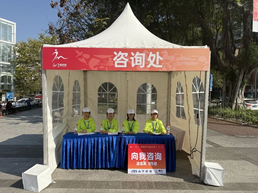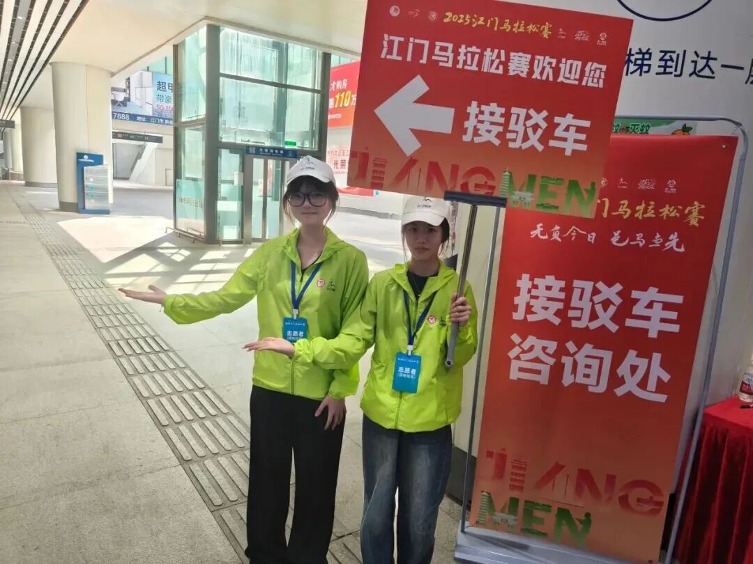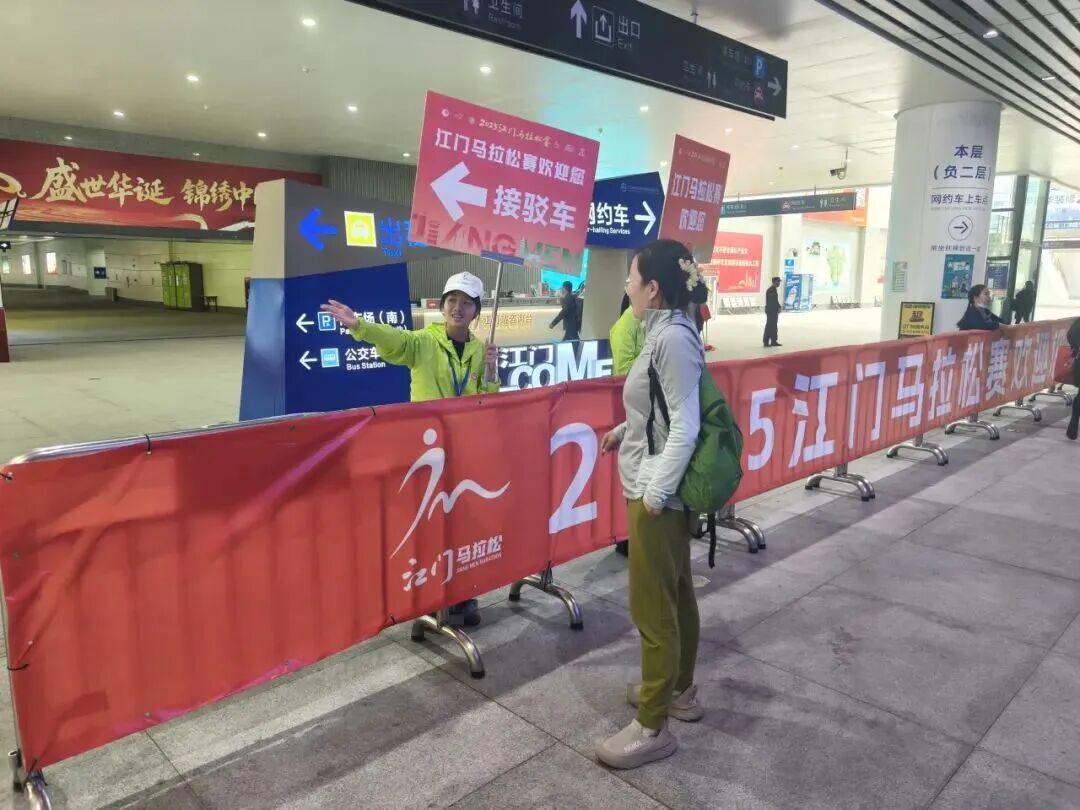 “您好!欢迎莅临2025江门马拉松赛,接驳车乘车点请往这边走。”