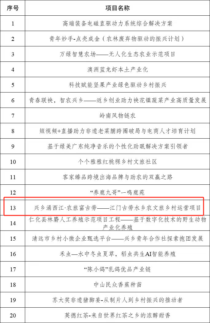 在2025年“创青春”广东“百千万工程”兴乡青年创业大赛决赛中,我市兴乡青年、鹤山市古劳镇强村公司乡村CEO黄德清以创业项目《兴乡涌西江·农旅富古劳——江门古劳水乡农文旅乡村运营项目》荣获省赛“优秀项目”,获得30万元项目资助金。